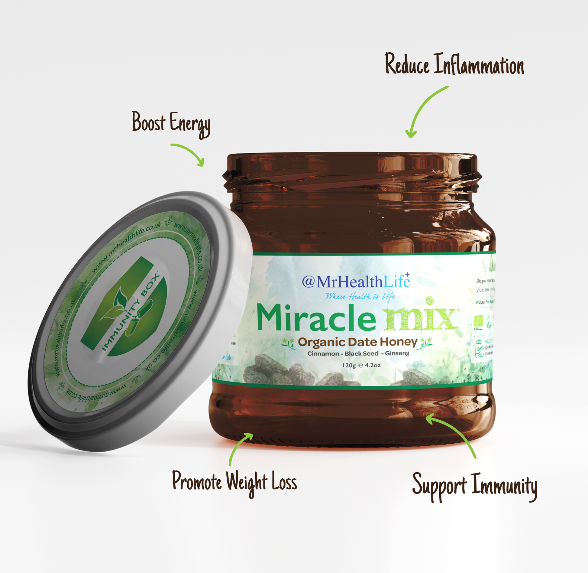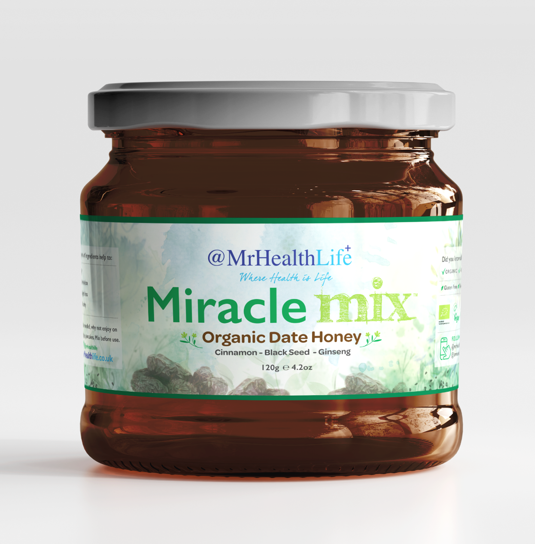 This is our delicious and unique blend of organic Royal Date Honey with Ginseng, Cinnamon and Black Seed designed to support and boost your bodies immunity as well as: